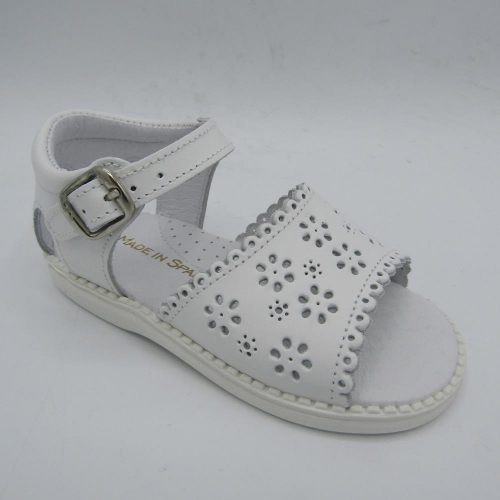 Bonita sandalia fabricada en piel troquelada motivos florecitas.