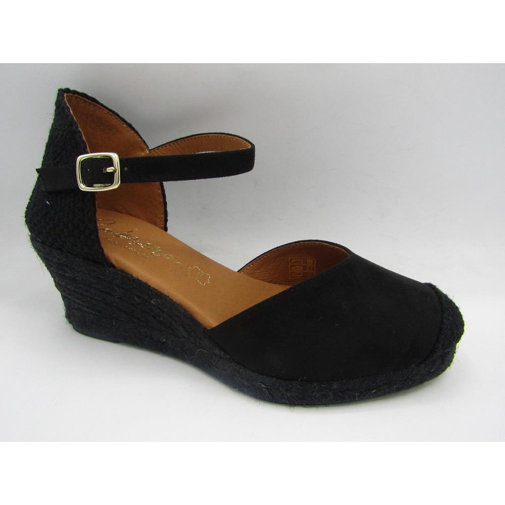 Sandalia con cuña de esparto negra para mujer de la marca española Cabrera 29N5. Puntera y talón cerrado con pespuntes al tono. Con hebilla dorada para un buen ajuste. Plantilla de piel para una buena transpiración. Cuña forrada de esparto de 7 cm con piso de goma muy comodo y estable. Ideal para el dia a dia.