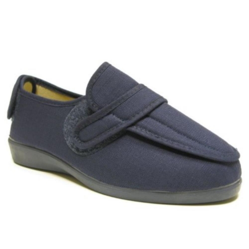 Zapatilla  para hombre de Doctor Cutillas, de color azul marino, fabricada en textil con un gran calce para adaptarse a los empeines más anchos. Cierre mediante velcro en el empeine y otro trasero para una óptima sujeción del pie. De fábrica esta zapatilla viene acompañada de unas plantillas extraíbles. Piso de goma antideslizante con cuña de 1,5 cm de altura. Horma Extra Ancha.