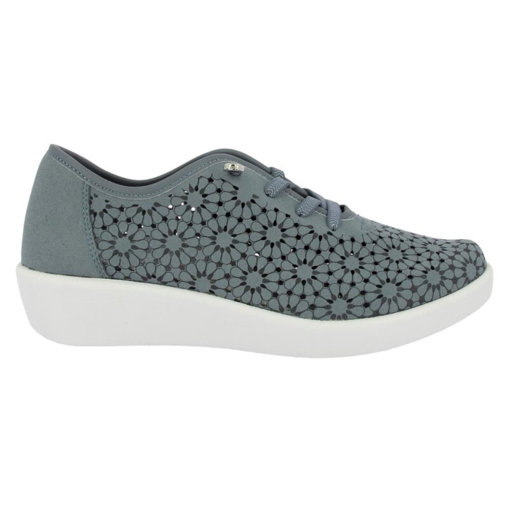 Deportivo para mujer tipo inglés con picados láser en color pacífico. Cuenta con talón reforzado, cierre de cordones elásticos, plantilla extraíble y suela de go