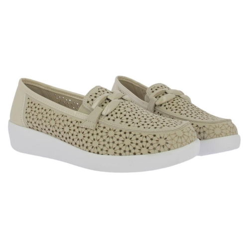 Mocasin para mujer tipo inglés con picados láser en color pacífico. Cuenta con talón reforzado, cierre de cordones elásticos, plantilla extraíble y suela de go
