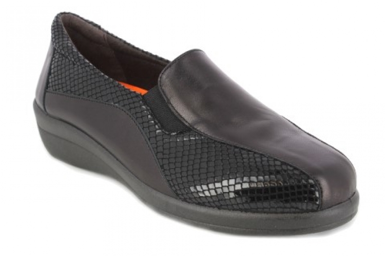 Zapatos mocasines de confort para mujer de la marca española DOCTOR CUTILLAS especializada en calzado para pies delicados, fabricadas en corte de materiales combinados de piel antracita con licra adaptable y suelas de goma con cuña de confort de 3.5cm. de altura.