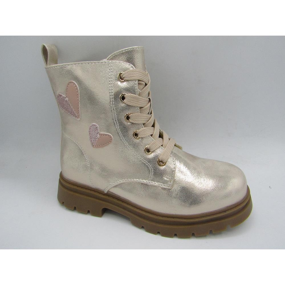 Bota infantil  tipo militar  con acabado metalizado, fabricada en material sintético el exterior y con forro  textil en el interior. Cierre lateral con cremallera, caña ancha, suela de goma resistente y antideslizante.