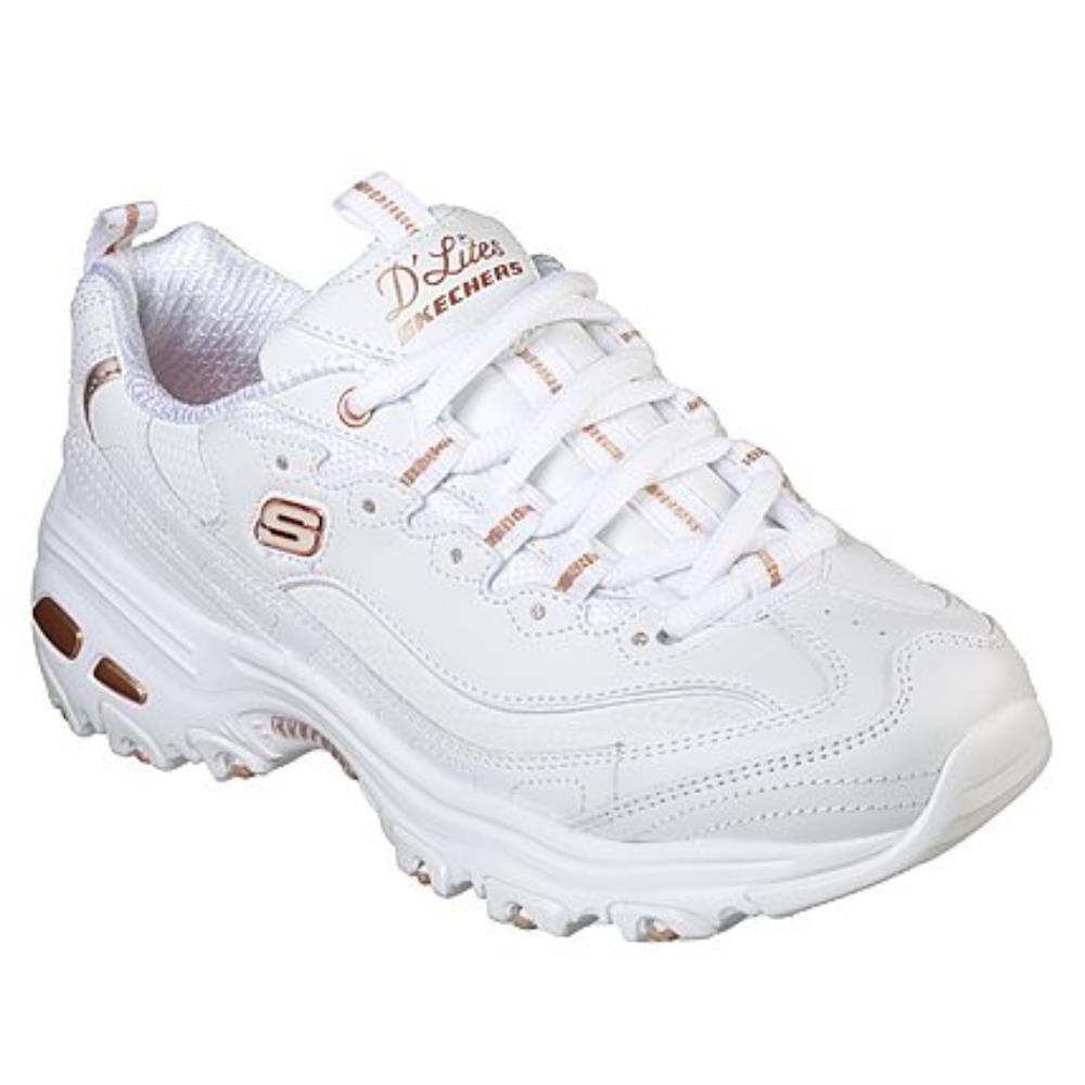 Pon tu mejor pie adelante con un look clásico revitalizado con la Skechers D'Lites® - Fresh Start. Modelo deportivo de cordones con parte superior de piel lisa y piel sintética, y plantilla con amortiguación SKECHERS Air Cooled Memory Foam®