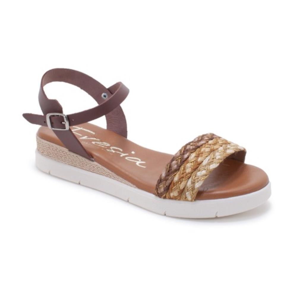 Sandalia de mujer con cuña baja y una pequeña plataforma, con sujeción de hebilla y tiras  en el empeine, hecha en piel y planta de gel, fabricada por Valerias, modelo 450 nuez.  Como detalle lleva la planta de gel acolchada, una sandalia cómoda para usar este verano.
