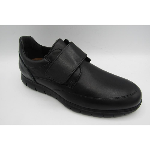 Zapatos con tira de velcro ajustable modelo E3207 fabricados en corte  de suaves pieles en color negro, con forros y plantillas interiores tecpell, con suelas flexigel, goma que mejora el apoyo del pie y la tensión articular en rodillas y tobillos
