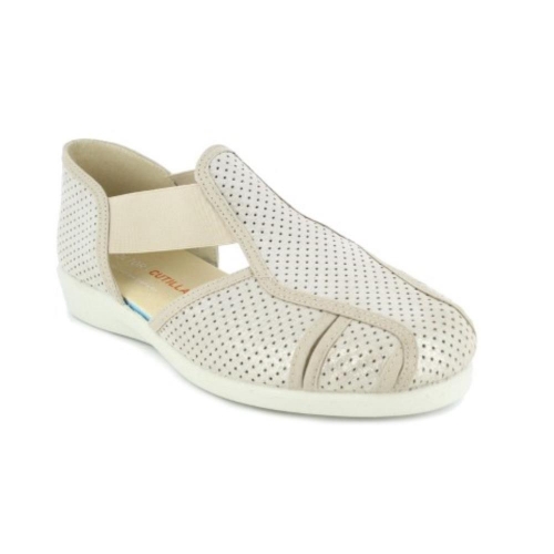D. Cutillas.Zapatilla señora de verano, estilo sandalia, con aberturas laterales, corte tejido picado brillante, en color beige, adorno de ribete con pespuntes de tela al tono, prácticos elásticos laterales para facilitar el calce. Horma con ANCHO ESPECIAL y plantilla extraíble antimicrobios, para la protección e higiene del pie, suela de goma al tono. Fabricada en España.
