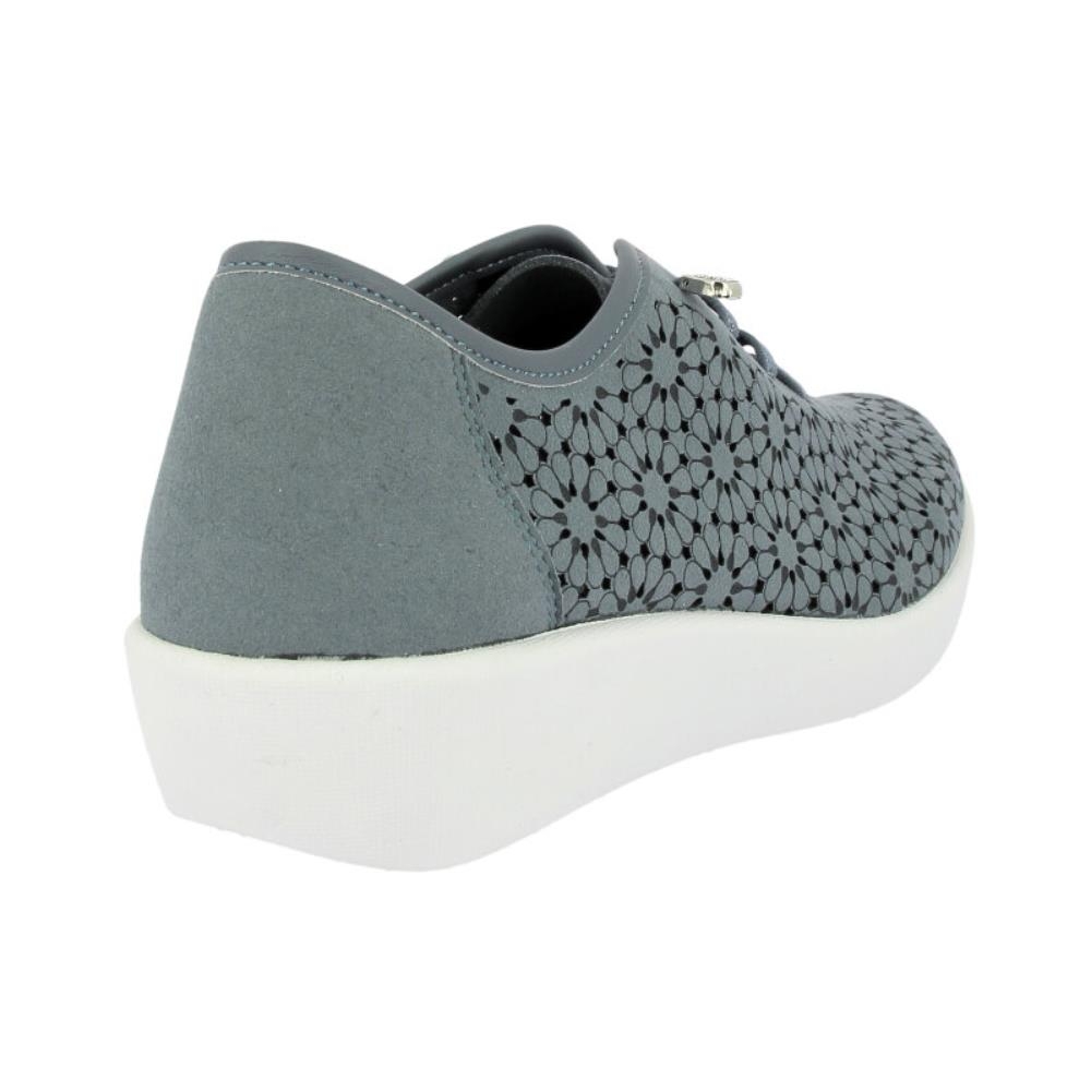 Deportivo para mujer tipo inglés con picados láser en color pacífico. Cuenta con talón reforzado, cierre de cordones elásticos, plantilla extraíble y suela de goma súper ligera. El material picado favorece la transpiración del pie en los días más calurosos.