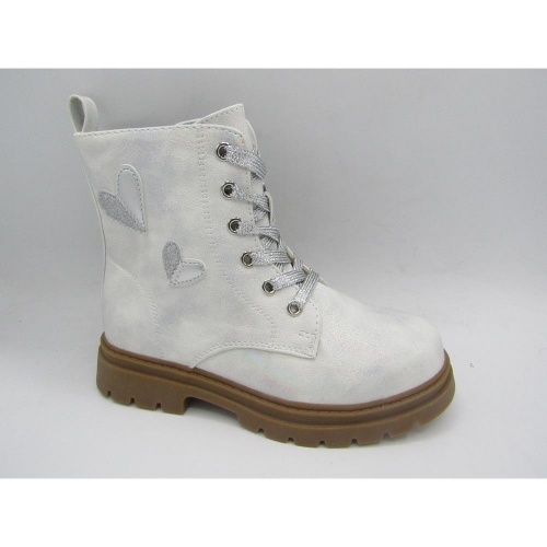 Bota infantil  tipo militar  con acabado metalizado, fabricada en material sintético el exterior y con forro  textil en el interior. Cierre lateral con cremallera, caña ancha, suela de goma resistente y antideslizante.