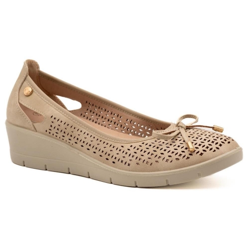Francesita calada, de color arena de la casa Mysoft, con lacito al empeine, plantilla extraible y suela de goma con cuña de 4,5 cm y plataforma de 1,5 cm.